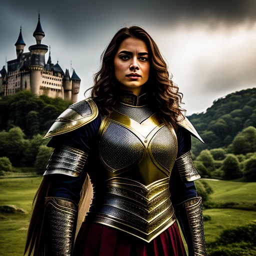 a portrait of a female warrior with an armour, a castle in the foreground