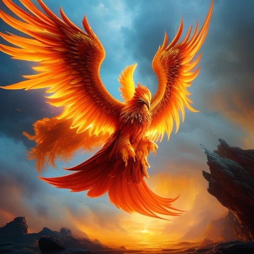 An abstract ((oil painting)) with extremely thick impasto technique to create a phoenix-like form. The canvas should be alive with bold, heavy, and tactile strokes of paint, giving a 3D texture that can almost be felt visually. Vivid oranges, intense reds, and bright yellows surge forth from the center, simulating the fiery core of the phoenix, while the outer edges should transition into deep blues and subtle grays, reminiscent of smoke and ashes. The central figure of the phoenix should be implied rather than explicitly defined, with the strokes themselves forming the suggestion of wings and a tail, emphasizing the concept of a phoenix rising from chaos. The heavy application of paint should result in ridges and peaks on the surface, enhancing the visual impact of the rebirth.