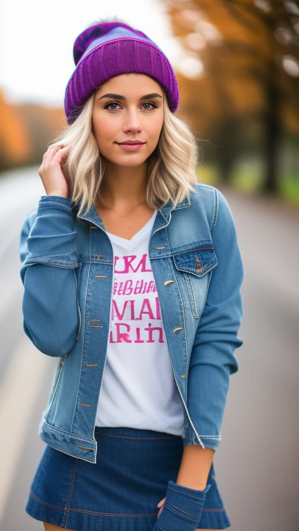 girls, pixie hair cut, mini skirt, beanie, bracesh, tight denim jacket