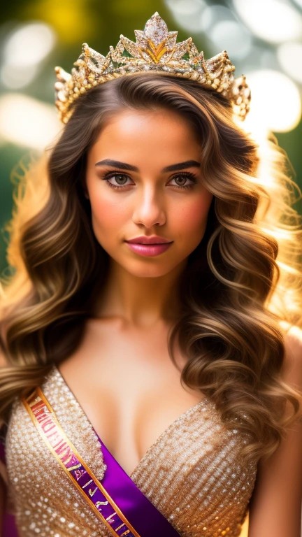Miss NEW YEAR 2024 pageant, attractive young woman in her 20's, Eveningwear Style, wearing a ((single purple sash)), and ((diamond encrusted tiara gold crown)), holding bouquet of yellow roses, midshot portrait, natural light, dark skin, natural look, hazel eyes, light brown hair, upper torso portrait, blurred background, natural light, photograph, detailed -- taken using a Canon EOS R camera with a 60mm f/4 lens, f/2.2 aperture, shutter speed 1/200s, ISO 300, Hyper Realistic Photography, Hyperdetail, Ultrahd, Color Correction, hdr, color grading, 8k --ar 4:5 --q 2