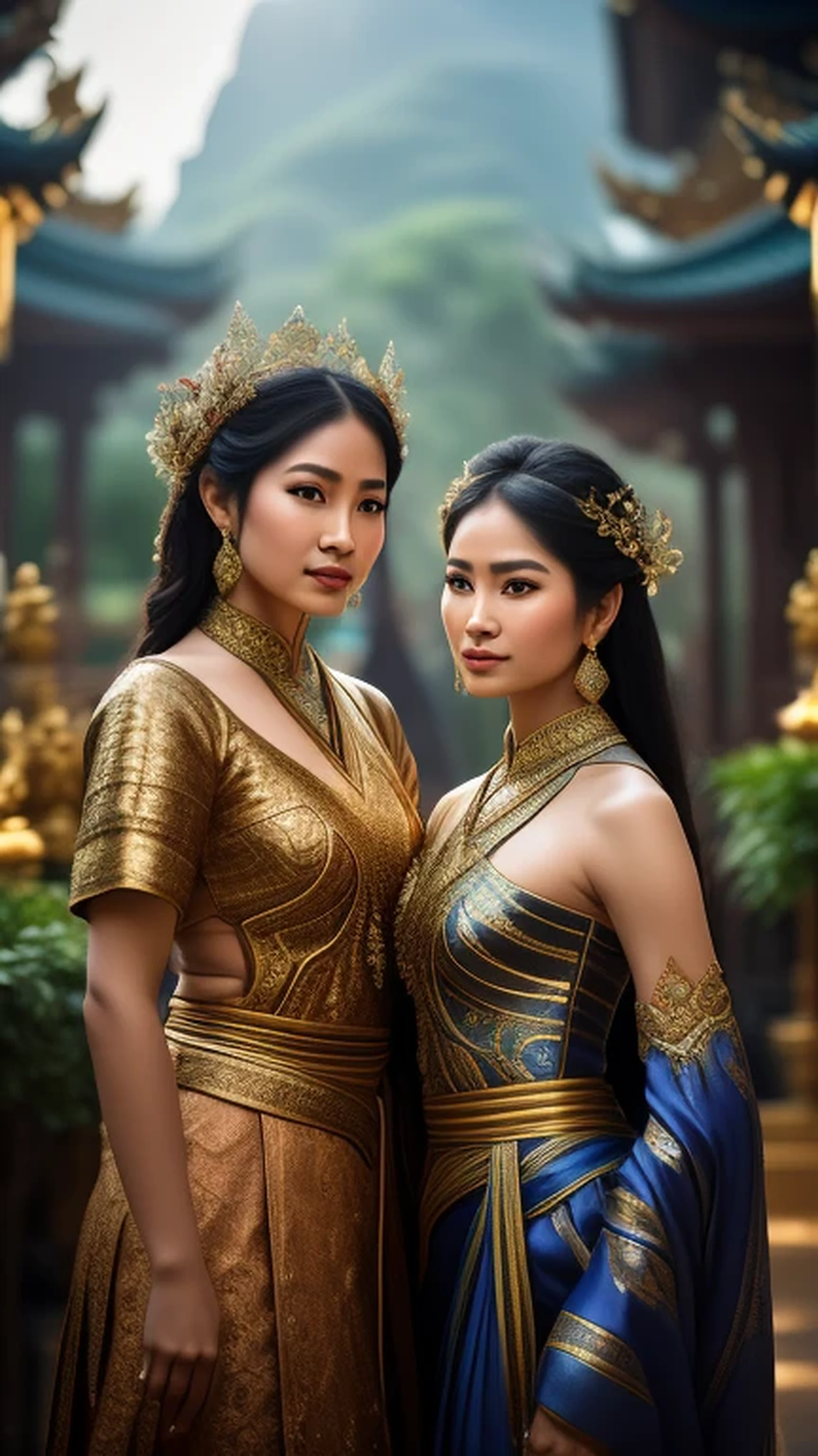 [[[two Thai dancers, female]]], Extremely detailed and (((in-focus))) photorealistic, detailed faces, traditional dress, standing, 25-years old. [[sharp rendering]], in front of a temple.