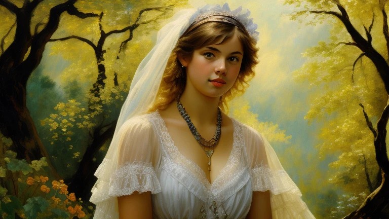 ... (((Eugene Delacroix)))... (((oil painting))) ... ((lascivious young woman)) ((with lace and colorful veils)) ((pearl necklace)) (flowers in blond hair) Crosses summer forest