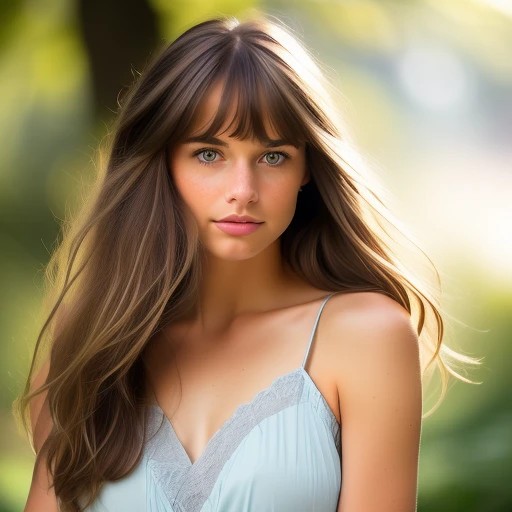 Extremely-detailed and (((in-focus))) photorealistic portrait of an attractive nude young woman in a park. busty She has ((((short, straight brown hair with bangs in a pageboy cut)))), ((and prominent pale blue-gray eyes that are rounded rather than almond-shaped)). (((Her eyes feature dark, round pupils rimmed by the wavy blue-gray marbling of her irises))), and are topped by ((((high, gently arching eyebrows)))).