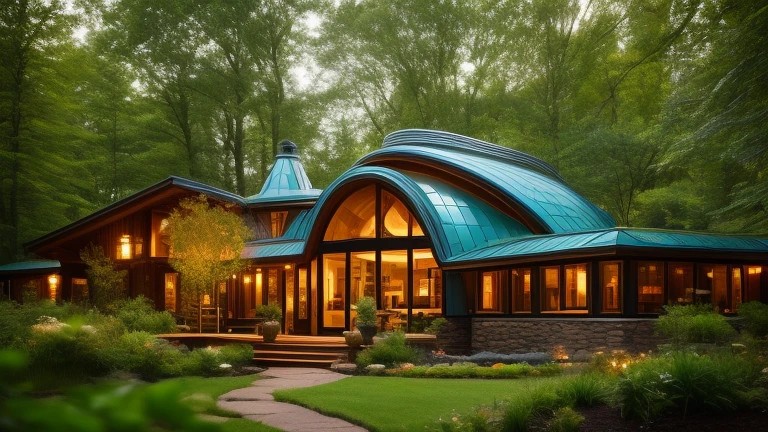Beautiful cottagecore ((earthship)) on a wild, natural expanse of land. land has hills trees tall and short grass flowers bushes. Small orbs of light hint at the magical undertone. Very natural land. Wild and fun.