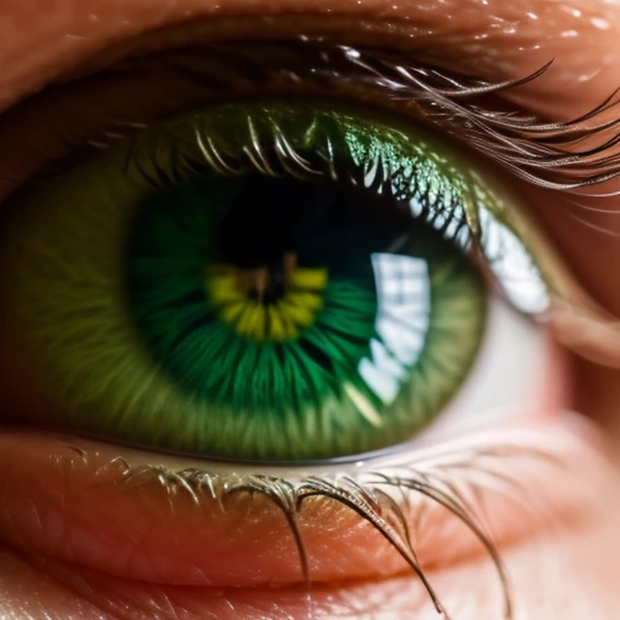 photorealistic painting of a human eye in close-up, featuring fluffy eyelashes and a green iris