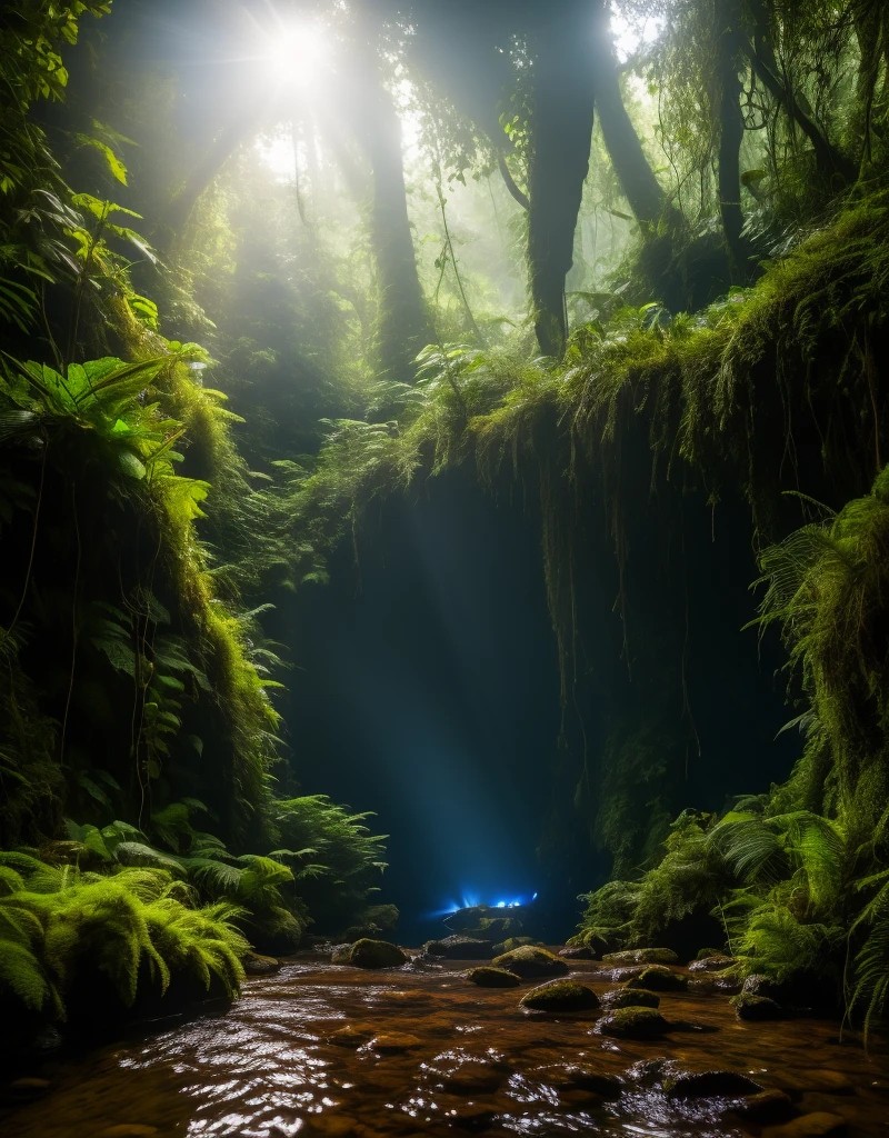 cave in a deep jungle with blue light sh...