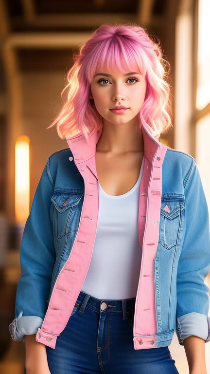 girls pixie cut hairpink bikini tight denim jacket at home