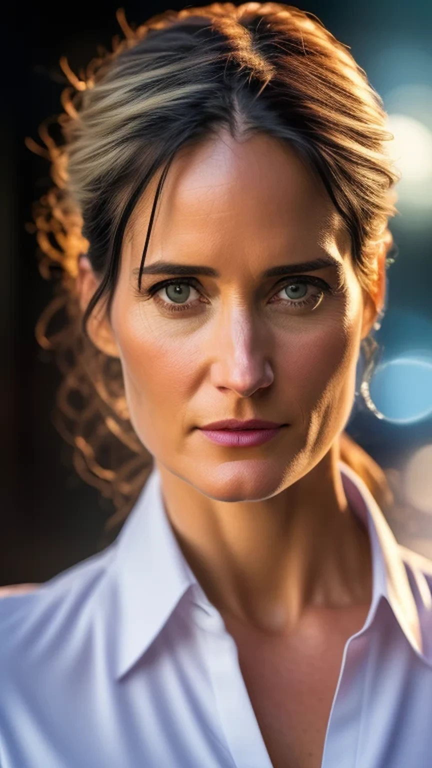 (long face:1.4)(((Photorealistic))),(showing full body) (Busty:1.3)blue jeans and a white man's dress shirt((Carrie-Anne Moss,)) (((ultra detailed))) (nighttime), 8k uhd
