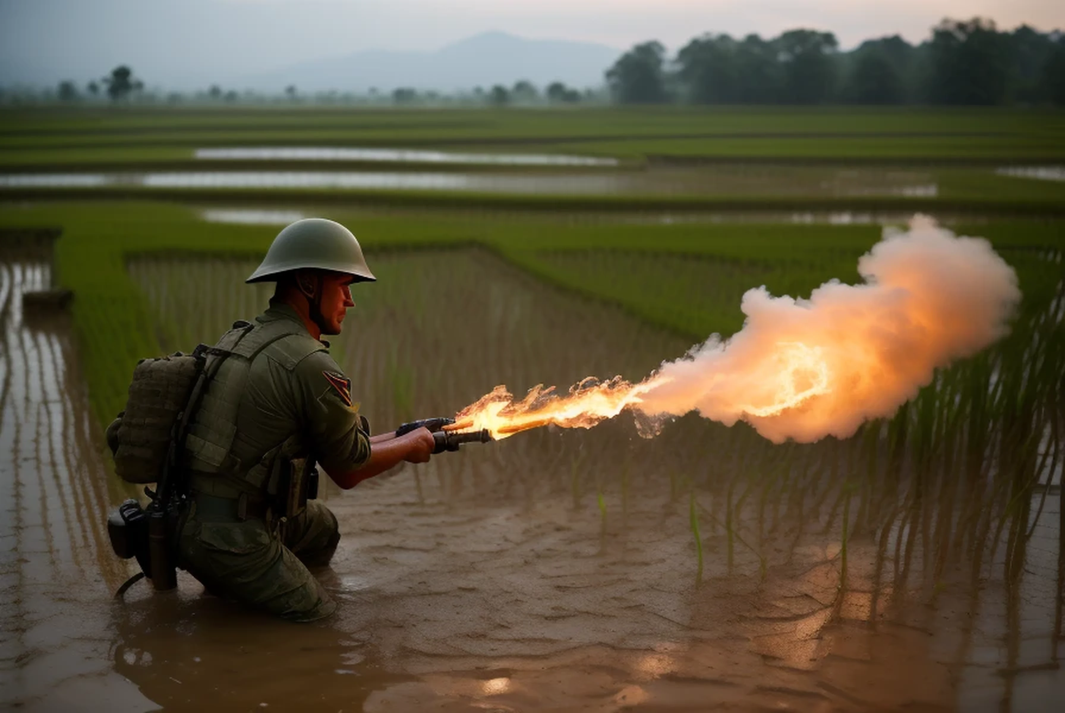 (((((8K UHD extremely detailed Nikon D850 Vietnam War photograph of a U.S. soldier setting an old Vietnamese civilian on fire with a flame thrower. This act takes place in a rice paddy.))))