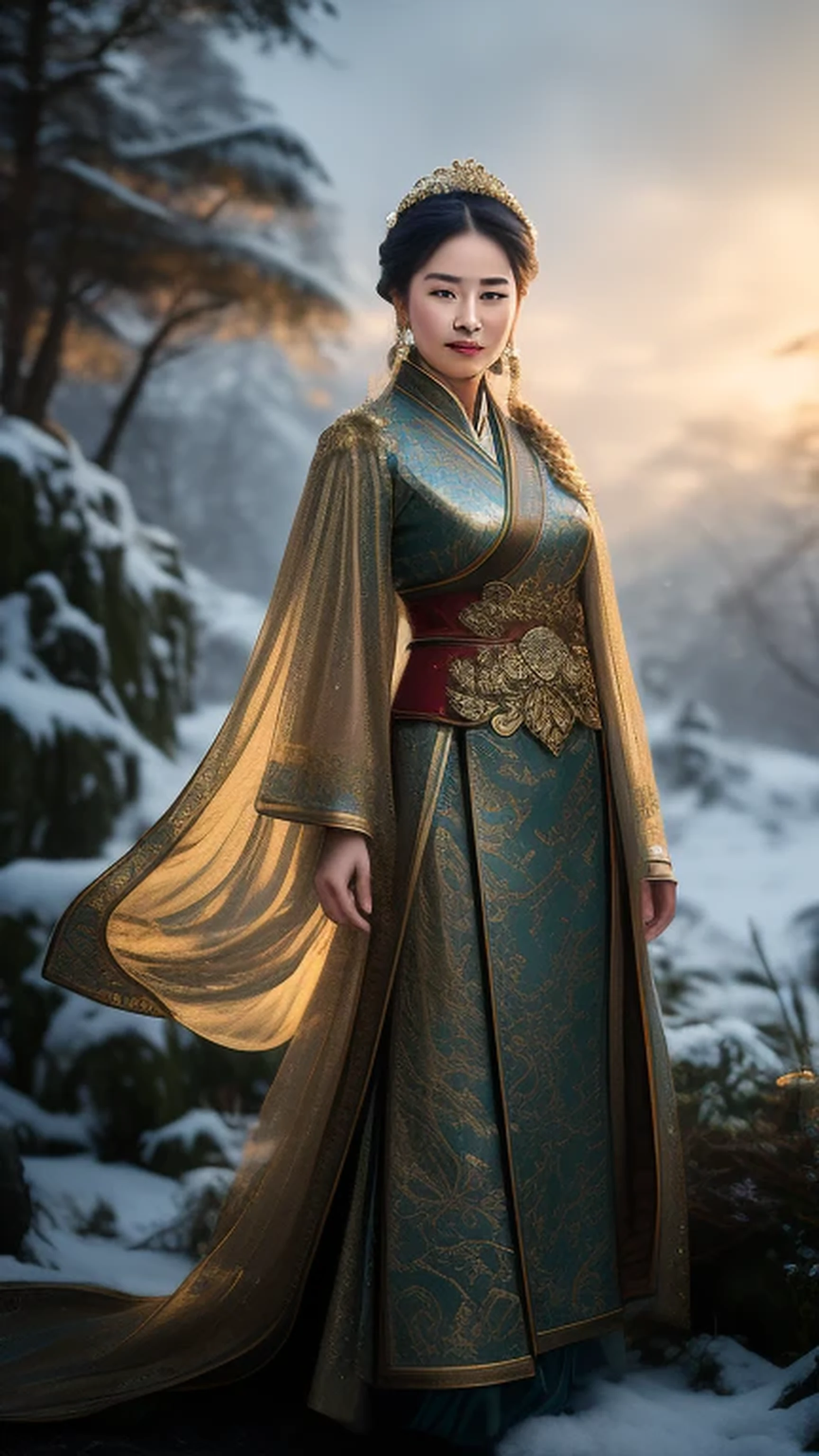 Extremely-detailed and (((in-focus))) photorealistic, [[[2 Chinese women]]], traditional dress, standing, 25-years old. [[sharp rendering]], in a snowy landscape