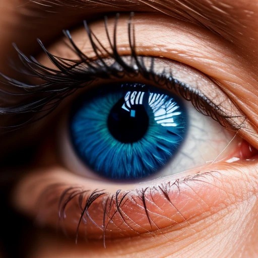photorealistic painting of a human eye in close-up, featuring fluffy eyelashes and a blue iris