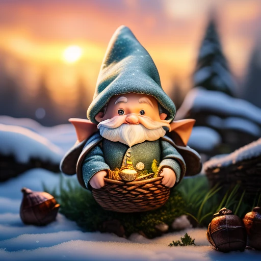 Little gnome with big eyes living in acorn, snowy landscape, sunset