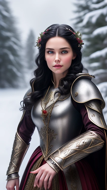 Snow White come to life. ((Photorealistic)), ((Detailed Face)), ((High Cheekbones)), ((Detailed Hands)), ((Feminine Hands)), ((Detailed Body)), ((Detailed Armor)), ((Action Poses)), ((8k)), ((uhd))