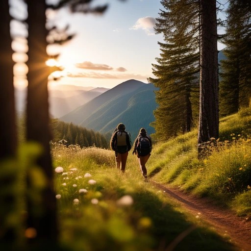 Hikers in beautiful nature. Sunset.
