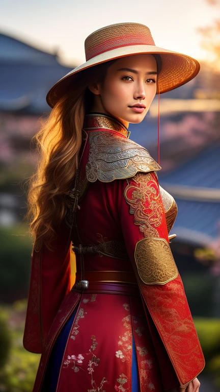 (best quality, masterpiece:1.2), highly detailed, photorealism, photo-realistic, high contrast, vibrant colors, colorful, (photorealistic:1.4), (perfect male figure), beautiful face, perfect illumination, beautiful detailed eyes, stunningly beautiful, detailed hairstyle, 8k high definition detailed realistic, photon mapping, radiosity, physically-based rendering, backlight, 1girl, from behind, female chinese assassins creed outfit, chinese village, (female samurai:1.1), wearing a chinese straw hat, cherry trees, flying leaves, standing on the edge of a building, looking down the city