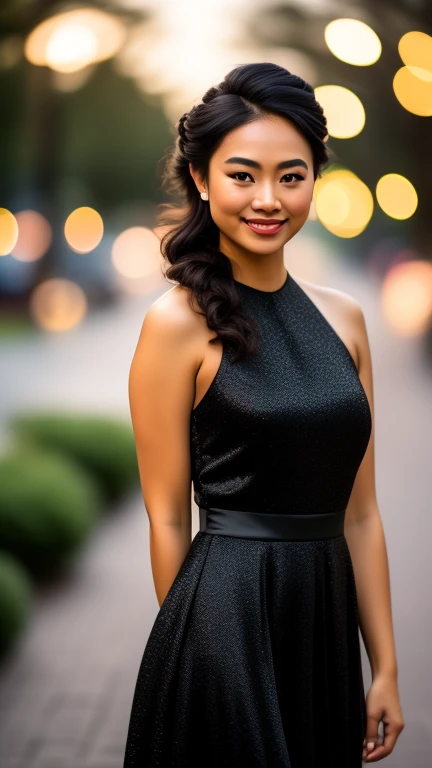 Small chested Asian, big smile, full length, black Evening dress, deep neckline, pixie hairstyle, and evening makeup