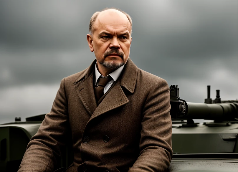 Vladimir Lenin on the armored vehicle circa 1920s in red trench coat with a (Mauser gun), screaming Hurray!