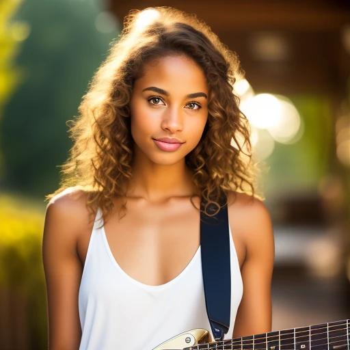 attractive young woman, light skin, natural look, hazel eyes, light brown hair, upper torso portrait, blurred background, guitar, natural light, photograph, detailed --ar 4:5