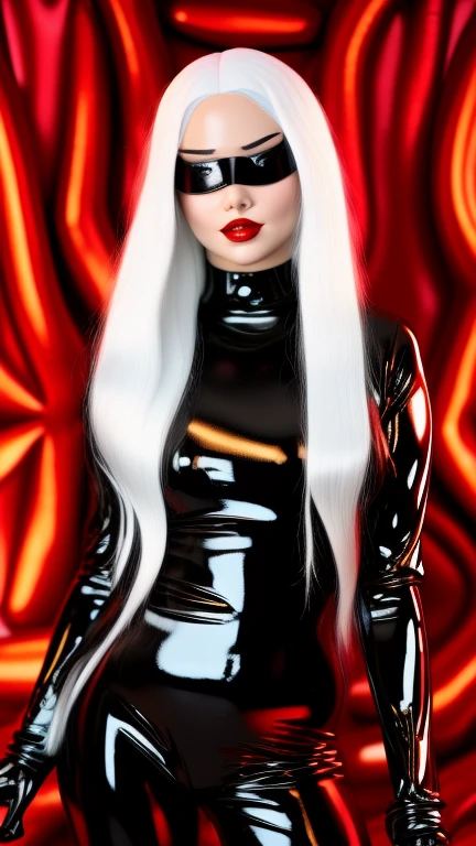models in Atex catsuit, unusual face, gothic, glossy latex, long white hair, full red lips, red blindfold, multiverse, black background, full view, ultra wide angle, depth of field, professional photography, ultra realistic, 4k resolution,super detail, golden hour lighting