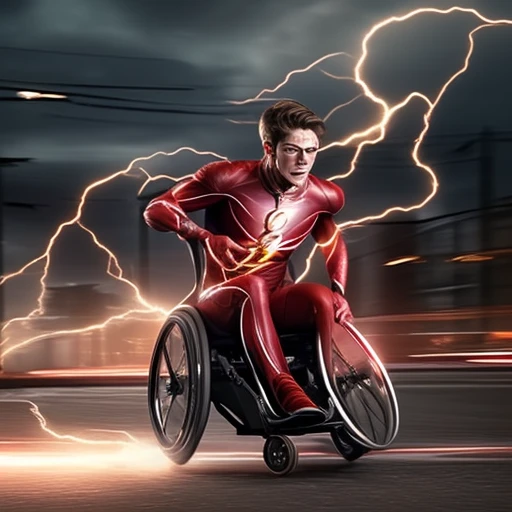 barry allen the flash on wheelchair moving at supersonic speed creating flame trails, speed trails, motion blur, electricity speed outdoor, realistic highly detailed cinematic cinematography, movie shots footage,
