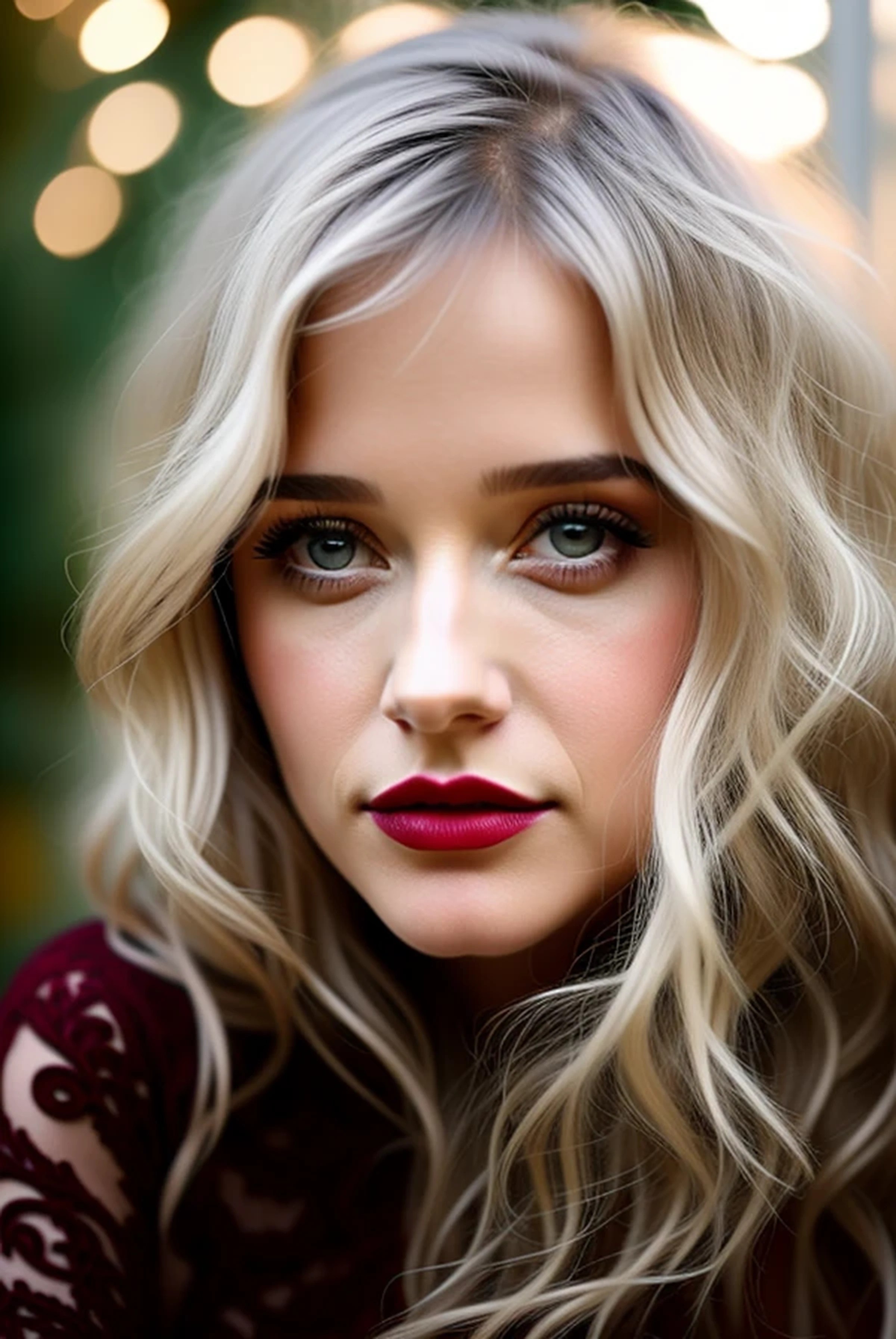 ((8K UHD extreme close-up, accentuating the stunningly beautiful pale blue-gray eyes)), ((outdoor, garden background, mid-morning natural light)) (((finely-detailed facial features, including the wavy radial stroma of the irises,))), (((entire subject's face, hair and clothes in very sharp focus))). Image is of a beguiling blonde-haired beauty with (((bleached platinum-blonde hair in a short, extremely sophisticated pixie cut inspired by Patrick Nagel's 1980s series of prints of chic women on the cutting edge of style))). She has beautiful (((pale blue-gray eyes))) with ((long, dark lashes)), ((dark eyeliner)) and (((dark bronze eye shadow for a classic and sexy "smokey eye" look))). (Some concealer, and dark pink blush on the crest of her cheeks, enhances her beauty 1.8). The woman is in her early 20s, and (((wearing a dual-layer silk dress: the top layer is black silk that has had an intricate fractal pattern laser-cut from the dress, so it resembles thick lace, while the bottom layer is scarlet silk and bonded to the top layer, resulting in a complex black-and-red texture)))). ((She is tall and slender,)) with (a runner's build -- lean, with a well-defined musculature -- with modest B-cup breasts 1.8). Facially, she's a mix of (Léa Seydoux 1.8), (Zooey Deschanel 1.8), (Brittany Murphy 1.9), (Ellesse Cheale 1.8), (Lydia Bielen 1.8) and (Natalia Dyer 1.9), with (the nose of Olivia Newton-John 1.9) and ((the mouth and teeth of Noelle Brown)). (Lips are relatively thin and natural). She also has ((significant puffiness under her eyes, like she is severely sleep-deprived)), plus ((full, but natural lips)) and ((a light sprinkling of very light, indistinct freckles across her cheeks, nose and chin with the concentration heaviest on her nose 1.8)), and ((a slight overbite that exposes the bottom half of her upper front teeth a bit more 1.5)). She has long, fine eyelashes. (((Her lips are done up with glossy dark burgundy lipstick, like they are painted with blood))).