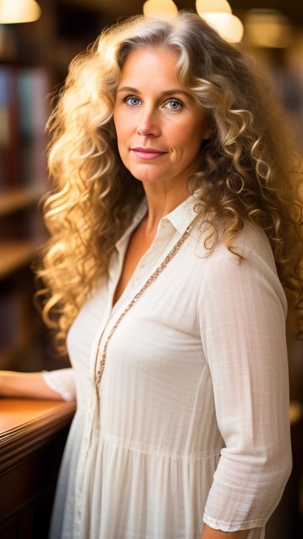 a 50 year old white woman. lingerine. brown curly hair. library as background.