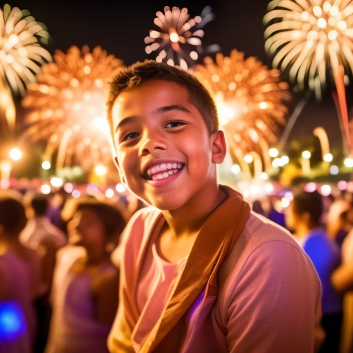 New Years Eve Fireworks Celebration Ecstatic (Male) Children in foreground ((Over-the-Shoulder Shot)), ((perfect smile and teeth))