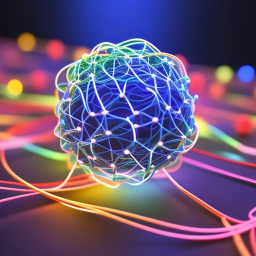 A 3D illustration of a neural network, with transparent nodes and glowing connections, showcasing the varying weights as different thicknesses and colors of the connecting lines.