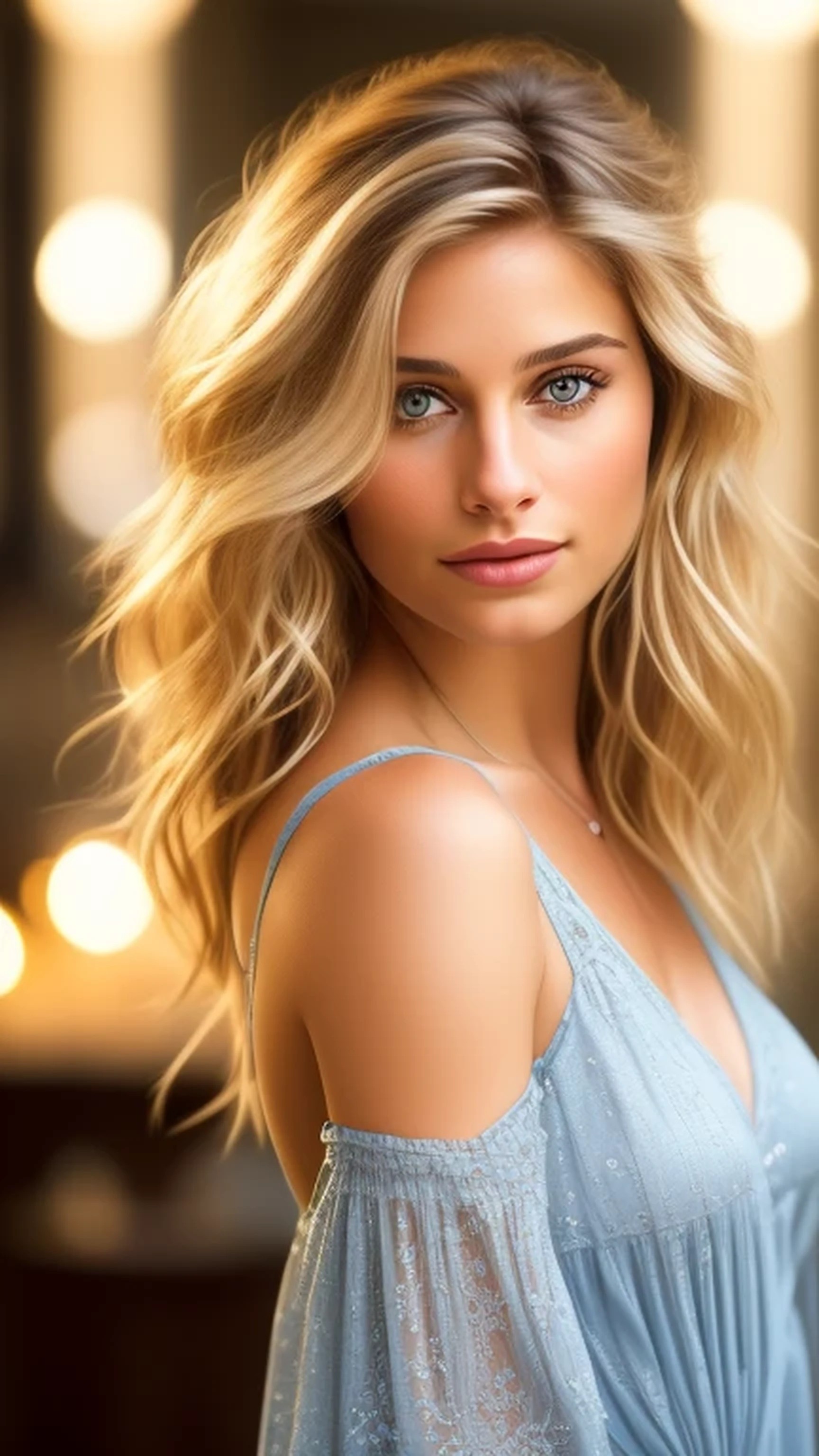 A very detailed and photorealistic picture of the actress Helen Slater. ((Her blonde hair has been styled to look exactly like actress Lindsey Wagner's hair in the film The Paper Chase)) She is wearing a pale blue dress and smiling. Fine detail is visible in her hairline and the fine and barely visible smile lines on her face. The depth of field is f9, so every aspect of her face and hair is in very fine detail. She is wearing dark eyeliner, and her face has a healthy glow that is very appealing. This is a stunningly good picture of her.