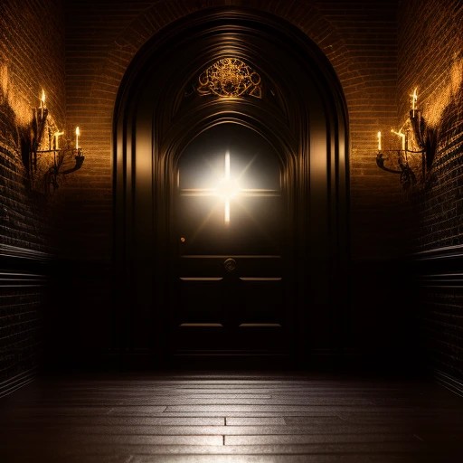 The CHRIST Light Divine Shining Around the Eerie Black Door and Darkened Walls in 3d, ((Long Shot)), ((photo-realistic)), ((uhd)), ((detailed)),
