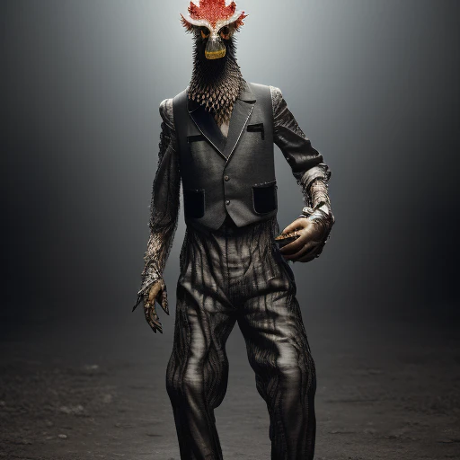 masterpiece,best quality,ultra high res,realistic skin,Dramatic lighting,1chicken man, ((anthropomorphic)),Black high-necked clothes,((Braces trousers)),playing basketball,