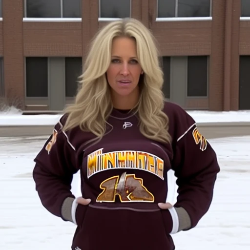 pretty blonde Minnesota gophers coaches wife looking sad in run down part of Detroit wearing Gopher jersey in the snow