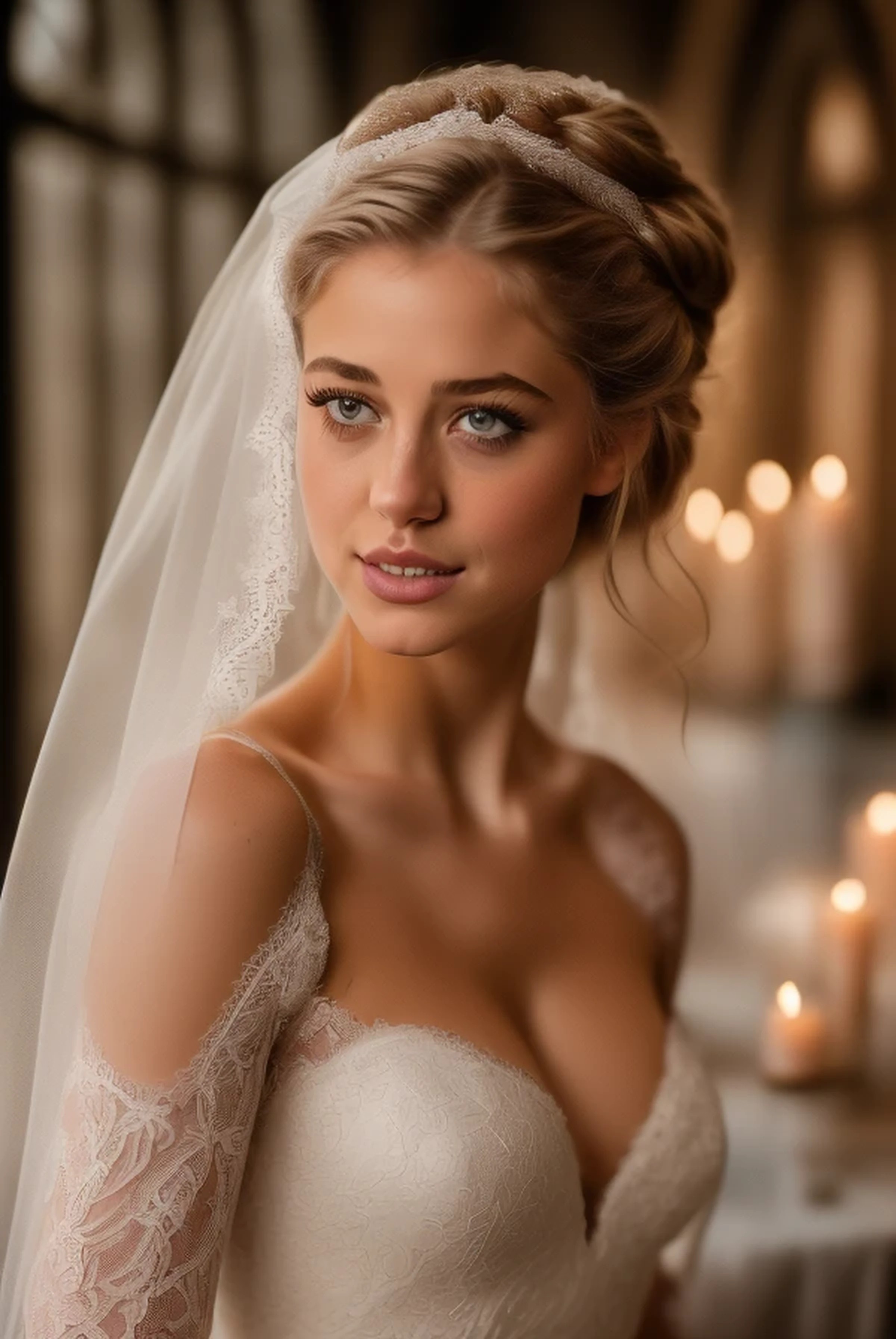 ((High-resolution Associated Press)) ((close-up)) of a young Caucasian woman at the altar in a church, (smiling). (((It is a summer evening, with candles supplementing the fading evening light))). She is made up like a model: (((light mascara applied to thicken her curled lashes; a thick line of black eyeliner adorning both upper and lower eyelids; glittering dark plum eye shadow, turning the span from eyelid to eyebrow a rich dark purple))), and a ((((glistening layer of Trophy Wife Crème frosted pink lipstick brightening her lips))). She has stunning (((shoulder-length Nordic-blonde hair))) -- (hair pulled back from her forehead and face so her ears are completely uncovered and then tightly braided in a neat and elegant up-do). She has ((soft, pale blue-gray eyes)), with (((all the complex coloration and striations of a real human eye clearly visible))). Her eyes have ((perfectly round irises)) and (((round, dark pupils centered in the irises, and one-third their diameter))). (((Use of concealer and dark bronze blush on her cheeks gives her skin a smooth, flawless look))). The woman is in her early twenties, ((dressed in a Vera Wang white lace wedding dress with long train and bridal veil 1.9)). (She is tall, slender and athletic). Facially, she's a mix of (Melanie Laurent 1.3), (Brittany Murphy 1.9), (Elizabeth Turner 1.8), (Ellana Bryan 1.4) and (Natalia Dyer 1.9), with (the eyes and nose of Olivia Newton-John 1.9) and ((((model Noelle Brown's protruding maxillary central incisors)))). She has (full, sensual lips, though the upper lip is less full than lower lip). She also has ((puffiness under her eyes and deep lines demarcating the bottom of those bags)), and ((lightly freckled skin, which is still visible through her makeup 1.9)). ((She has a small overbite, with the front two teeth of the top row sit slightly larger and in front of the rest of the teeth in the top row 1.3)). (Her lips show fine vertical lines beneath the lipstick).