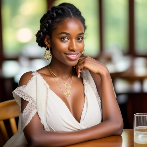 A very dark skinned woman with a lovely smile seated at a cafe table, ((detailed jewelry)), ((Ethiopia)), ((short tight hairstyle)), ((photo-realistic)), ((uhd)), ((down blouse cleavage view)), ((action poses)), (((zoomed in : 1.20))), ((highest resolution)), ((highest quality)), ((highest detail)), ((sharp focus)), (Perfect Face - [ Eyebrow, Eye, Eyelid, Nose, Mouth, Lip, Teeth, Scalp, Throat, Hair ] )), ((Perfect Limbs - [ Shoulder, Chest, Arm, Elbow, Forearm, Wrist, Hand, Finger, Fingernail, Thumb ] )), ((Perfect Limbs - [ Leg, Thigh, Knee, Calf, Foot, Ankle, Toe, Toenail, Buttocks, Hip, ] )),