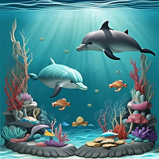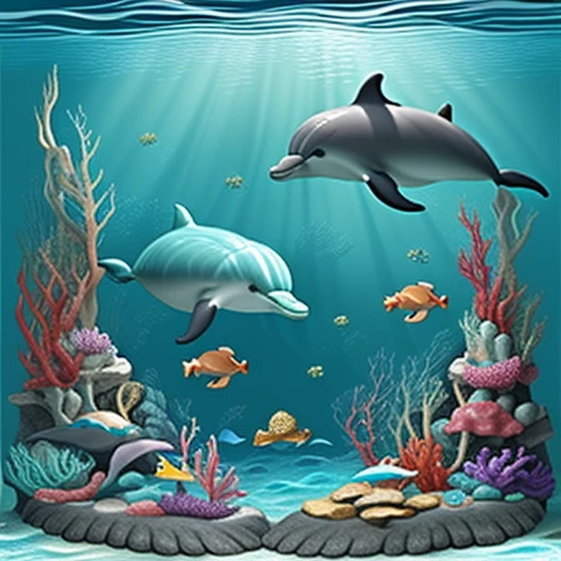 Create an underwater scene featuring friendly dolphins and mermaid schools