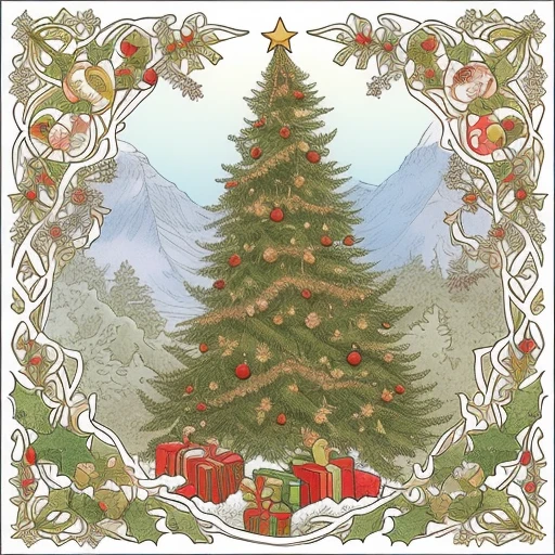 Christmas tree in Christmas card Mucha style