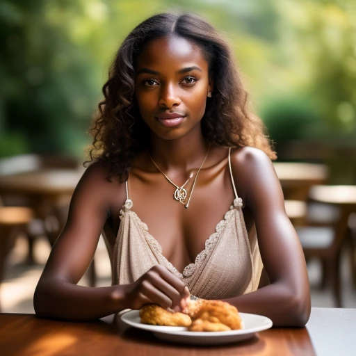 A very dark skinned woman with a lovely smile seated at a cafe table, ((detailed jewelry)), ((blacker than obsidian skin tone)), ((photo-realistic)), ((uhd)), ((down blouse cleavage view)), ((action poses)), (((zoomed in : 1.20))), ((highest resolution)), ((highest quality)), ((highest detail)), ((sharp focus)), (Perfect Face - [ Eyebrow, Eye, Eyelid, Nose, Mouth, Lip, Teeth, Scalp, Throat, Hair ] )), ((Perfect Limbs - [ Shoulder, Chest, Arm, Elbow, Forearm, Wrist, Hand, Finger, Fingernail, Thumb ] )), ((Perfect Limbs - [ Leg, Thigh, Knee, Calf, Foot, Ankle, Toe, Toenail, Buttocks, Hip, ] )),