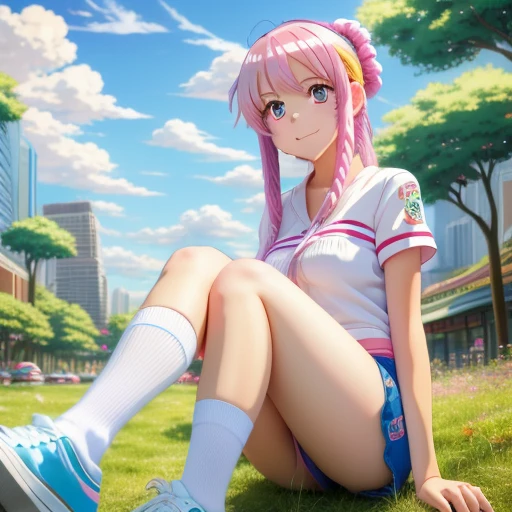 masterpiece, best quality, <lora:whitney-nvwls-v1:0.9> defwhitney, pink eyes, hair ornament, white shirt, short sleeves, blue shorts, wristband, large breasts, striped socks, sneakers, sitting, cityscape, clouds, looking at viewer, smile, grass, trees