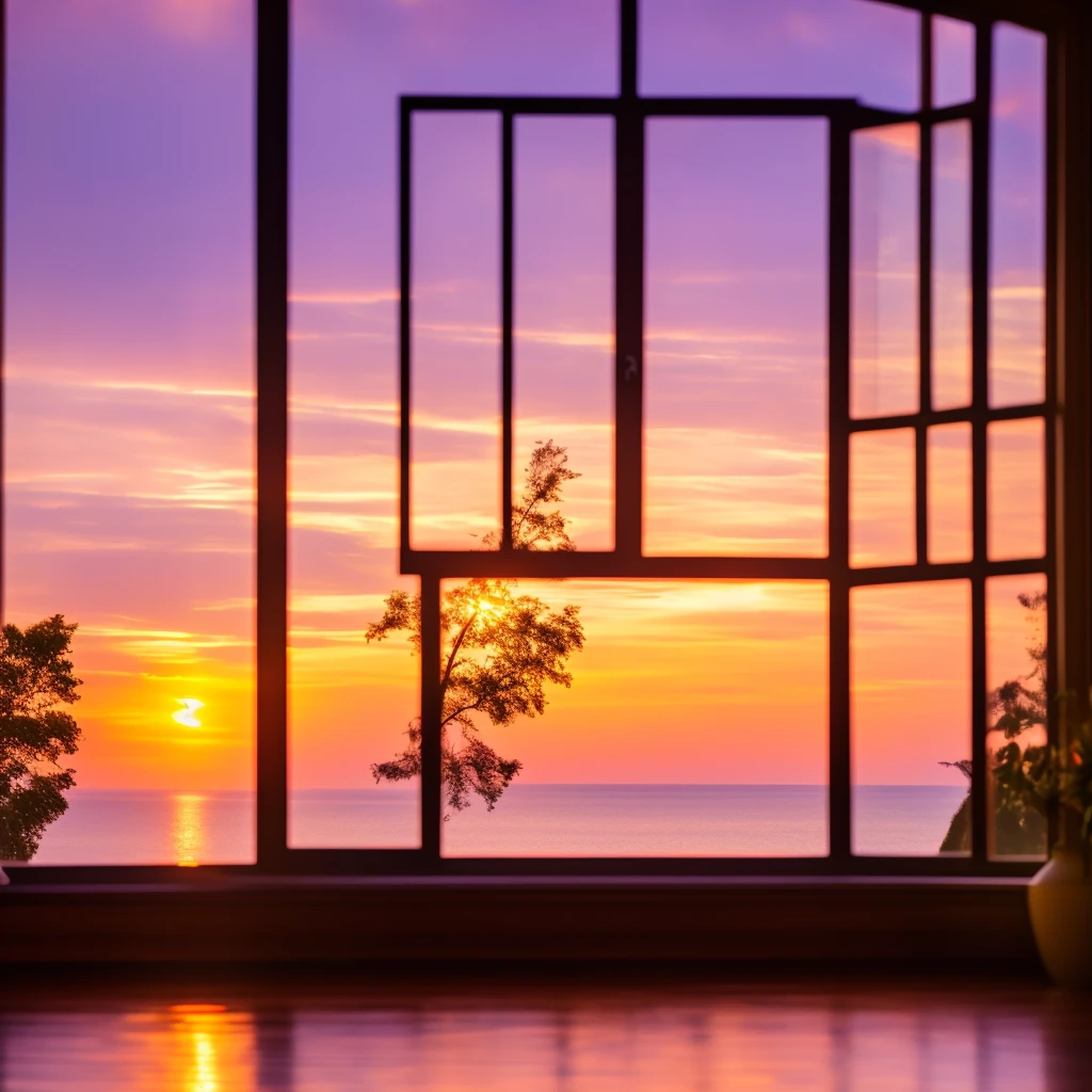 living room, with a huge window with a wooden frame, view of the sea, in a sunset, ((after the sun has gone down)), sky with violet, red, yellow and blue tones