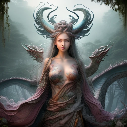 Be mesmerized by the enchanting sight of an 18-year-old girl donned in elegant Chinese attire, her flowing hair gracefully embellished with a captivating hair ornament. As flower petals sway in the wind around her, a majestic dragon wraps its serpentine body around her, creating a scene of mythical allure. Immersed in the deepest jungle river of a rainforest village, the lush greenery and vibrant flora surround them. Runes adorn the landscape, imbuing an air of ancient mysticism. The duo stands atop a mist-covered mountain, where snow-capped peaks reach for the sky. Soft light illuminates the girl's face, casting gentle shadows and capturing her ethereal beauty. Bokeh and distant neon lights add a touch of magic from afar, creating a dreamlike ambiance. The blurry background further enhances the cinematic quality, drawing attention to the splendid and hyper-detailed composition. Prepare to be captivated by the seamless blend of natural elements and fantasy in this artistic masterpiece.