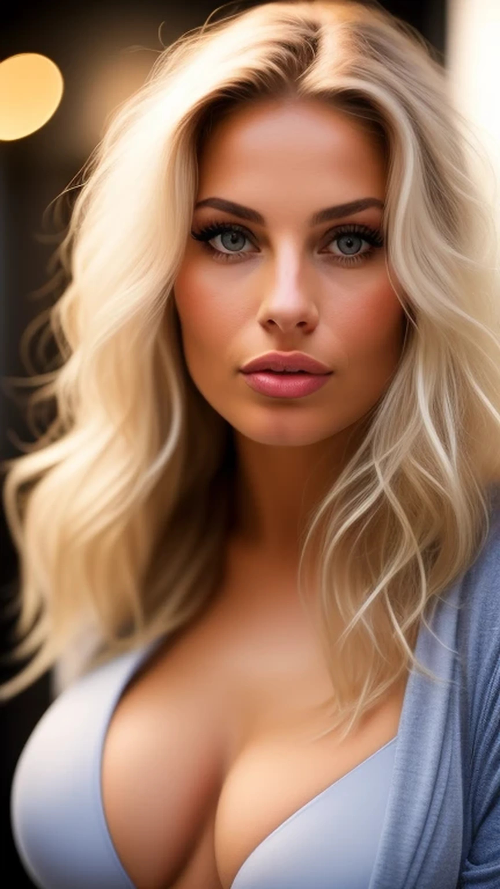 Detailed, in-focus photographic portrait of porn star ((Spencer Scott, circa 2014)) who is naked. Very sharp detail makes it possible to see texture details on the aureoles of her breast, texture of the skin on the nipples, and fine lines around her eyes and lips. Her face is dominated by a ((very wide mouth)) and (lips twice the size of normal lips), like a fuller version of Sophia Loren's. Her face narrows rapidly toward her chin, which is small and angular. Facially, she looks like a porn-star version of Lady Gaga: Gaga's nose and most prominent features exaggerated, or turned up a notch. Her nose is straight, she has high cheekbones partially masked by full, fleshy cheeks, and intensely blue eyes. Hair roots are clearly visible along the hairline on her scalp. Her hair is platinum blonde, is parted just to the left of center, and has dark brown roots giving way to waist-length pale blonde hair with a silky sheen to it. Her eyes are almond-shaped, close together, and angle slightly down toward the bridge of her nose, with heavy eyeliner and long false eyelashes. Her body measurements are 33-22-33, and her bra size is 38D, so her breasts look large and pendulous.