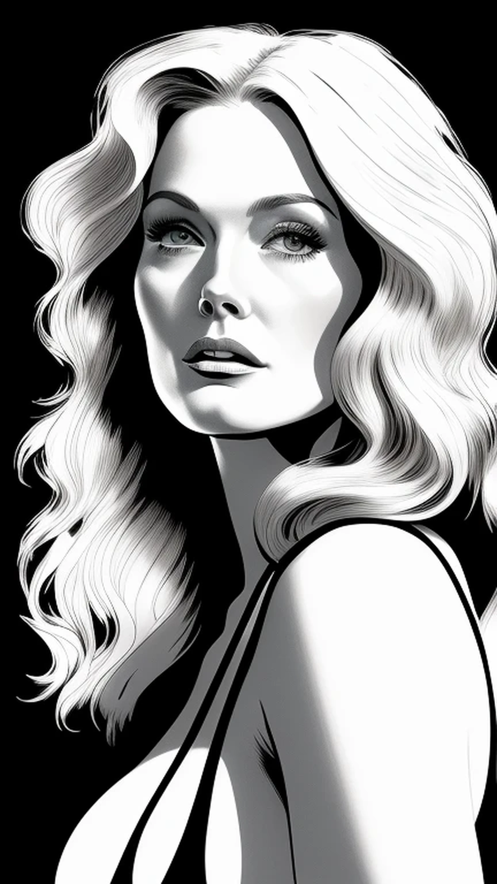 Sexy busty Julianne Moore profile portrait, Figurative, Ink, Minimalism, Rough, Midnight black, Underlit, Film noir, Frank Miller, Rough