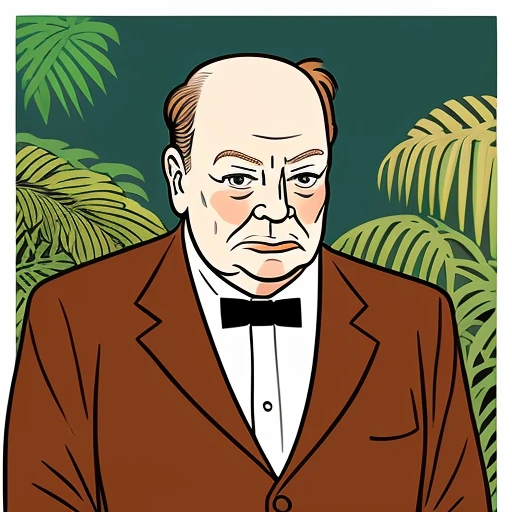 an illustration of Winston Churchill, in the style of mid-century, animated gifs, junglepunk, prehistoric art, vintage cut-and-paste, children's book illustrations, colorful animations