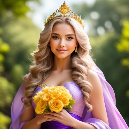 Miss NEW YEAR 2024 pageant winner, attractive young woman in her 20's, with a beautiful ((enchanting smile)), eveningwear style, wearing a ((single purple sash)), and ((diamond encrusted tiara style gold crown)), holding bouquet of yellow roses, midshot portrait, natural light, dark skin, natural look, hazel eyes, light brown hair, upper torso portrait, blurred background, natural light, photograph, detailed -- taken using a Canon EOS R camera with a 60mm f/4 lens, f/2.2 aperture, shutter speed 1/200s, ISO 300, Hyper Realistic Photography, Hyperdetail, Ultrahd, Color Correction, hdr, color grading, 8k --ar 4:5 --q 2