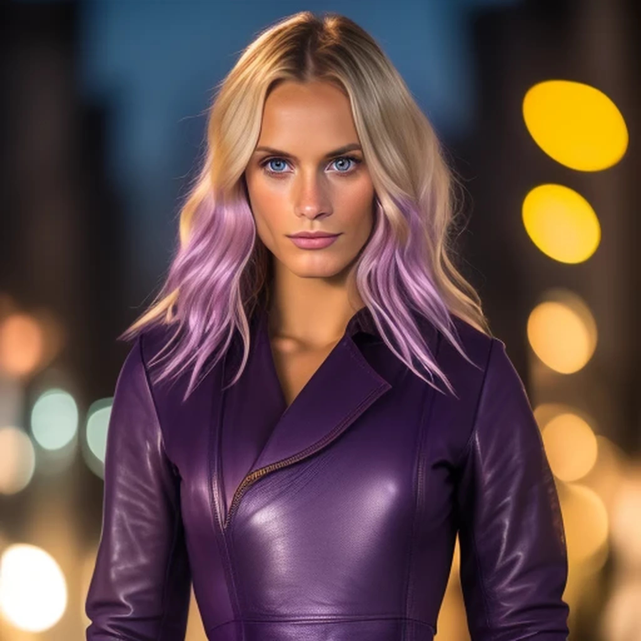 ((Poppy Delevingne:1.2))(long dark purple leather dress:1.6)(((Photorealistic))),(showing full body) (((ultra detailed))) (nighttime), 8k uhd (muscular arms:1.2) (hips:1.5)(thighs:1.5)(breasts:1.7)((High Cheekbones)), ((Detailed Hands)), ((Feminine Hands)), ((Detailed Body)), ((Action Poses))