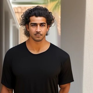 Provide a latino man in his mid twenties, caucasian with a nice sun tan, curly hair which is dark brown, his hair is long with a length to shoulder height. He has a square chin, fit body frame and has well shaven. He's dressing with a black shirt