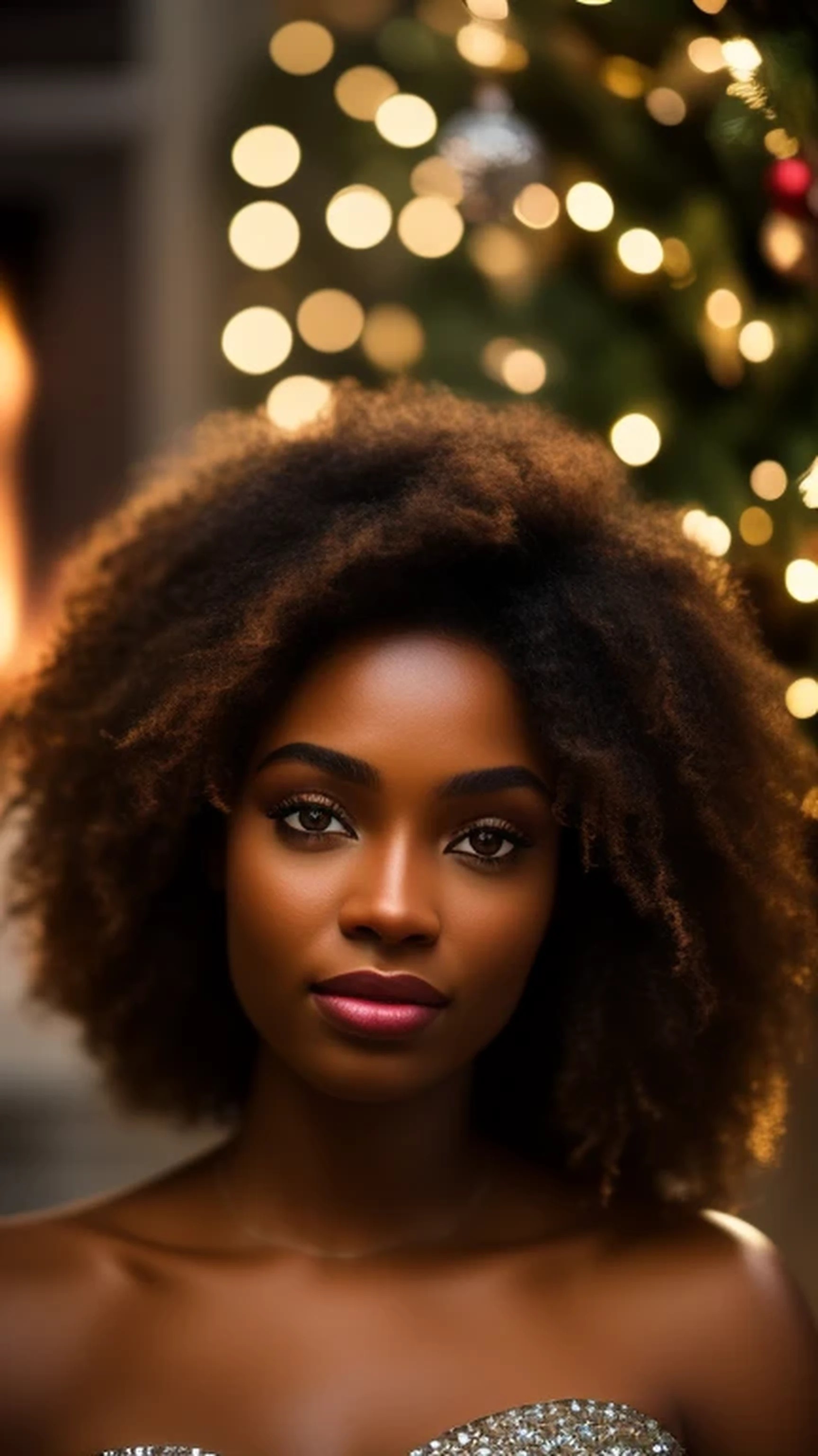 Extremely-detailed and (((in-focus))) photorealistic portrait of a nude young black woman, background - Christmas attributes - Christmas tree - fireplace.