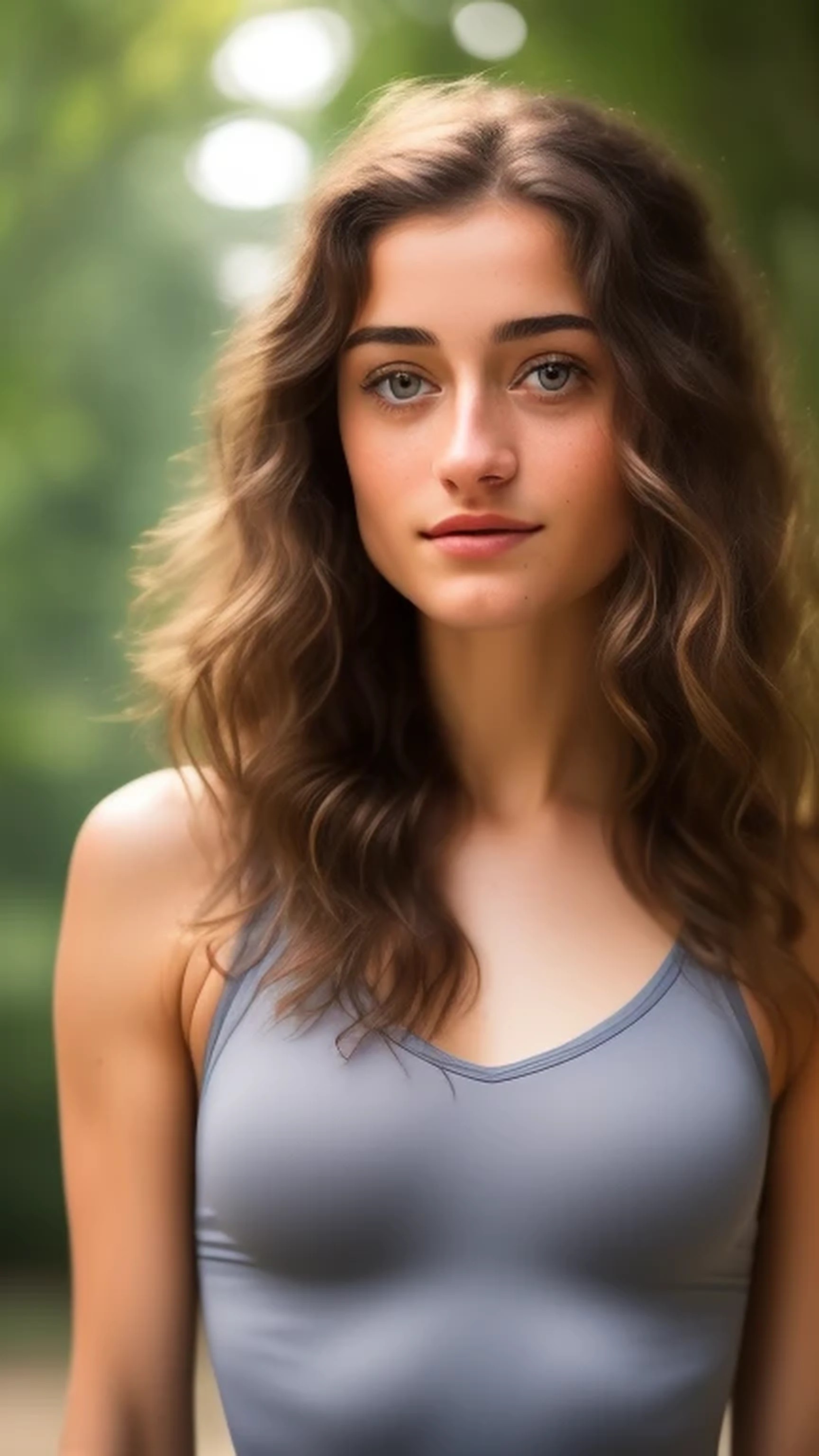 Extremely-detailed photorealistic portrait of an attractive young woman with ((pale, blue-gray eyes)) in a park. (((Her eyes are highly-detailed: dark, round pupils rimmed by the wavy blue-gray marbling of her irises))). The woman is in her mid-20s, and dressed in a (((black lycra running bra and black lycra running leotards))). (((She is slender, with B-cup breasts, and shoulder-length hair the color of cappuccino -- a mix of light- and medium-brown, with a slight waviness))) parted on the right hand side. Facially, she resembles a cross between (Melanie Laurent), (((Olena Zelenska))) and (((Natalia Dyer))), though she has (((visible puffiness under her eyes, a bluish cast to those bags, and visible lines separating that puffiness from her cheeks))), and (((thin lips))). She also has (a sprinkling of light freckles across her cheeks and nose -- freckles just slightly darker in tone than the adjacent skin -- with the concentration strongest on her nose), and (a slight overbite) that exposes her upper front teeth a bit more than the others when she smiles. Her face, hair and figure are all in sharp focus, but the bar behind her is mainly visible as bokeh due to the depth of field. She has long, fine eyelashes, and the eyebrows are detailed enough to make out individual hairs. The outline of the eyebrows is not perfectly straight, showing variation in the edges and the thickness. (Her lips show fine vertical lines, and are natural in color -- no lipstick or lip gloss). (((Her skin has visible blemishes and imperfections -- a few areas of mostly healed acne -- that keep her skin from being totally smooth.))) (There are also very fine -- almost imperceptible -- tiny hairs like peachfuzz across her cheeks and upper lip, dulling the reflectivity of the skin.)