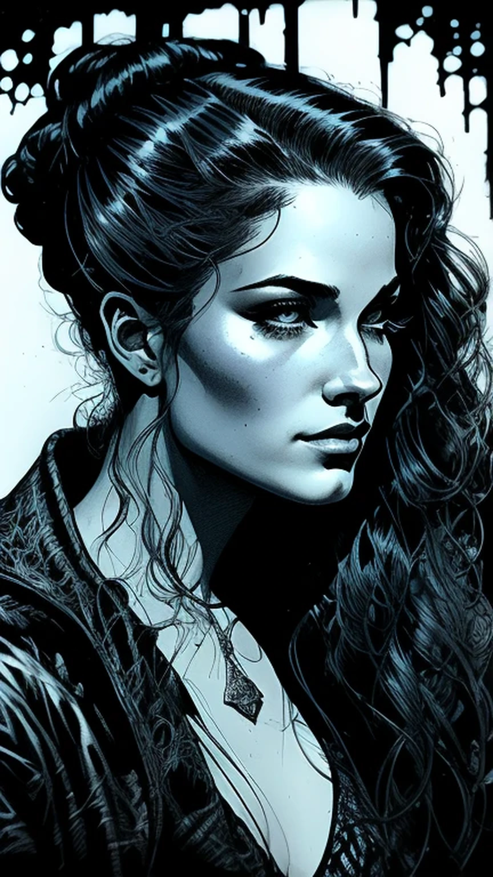 Morfydd Clark looking away close-up portrait, Figurative, Ink, Realism, Rough, Midnight black, Underlit, Film noir, Sean Gordon Murphy