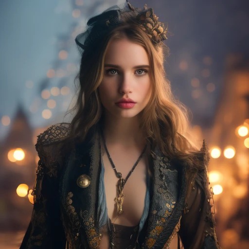 emma roberts topless steampunk style blue color dark castle in background